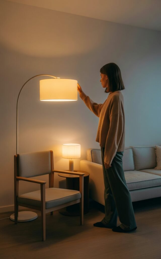 Floor lamps, table lamps, and even battery-operated LED strips add warmth and depth to any room. In a minimalist space, a single arc floor lamp next to a chair creates a cozy reading corner without any extra furniture. Swapping bulbs to warm-white LEDs in existing fixtures makes an instant difference. The goal is to have multiple light sources at different heights so the room feels warm and dimensional rather than lit from above like a grocery store.